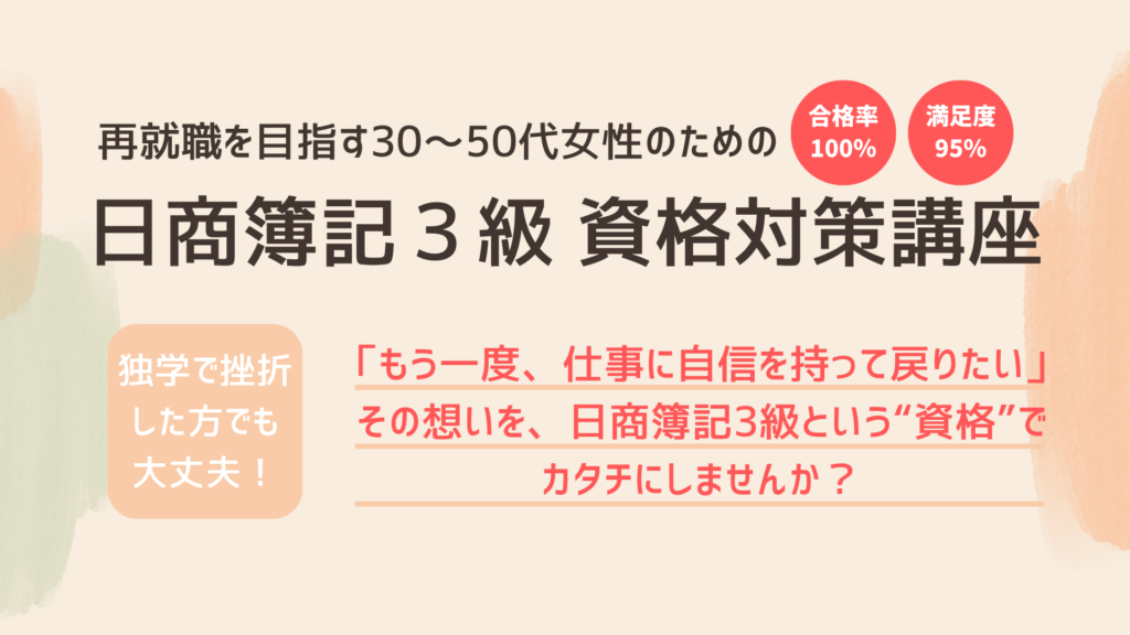 | 講座名 | 日商簿記3級 資格対策講座 (再就職を目指す30~50代女性向け/独学で挫折した方専門) |
